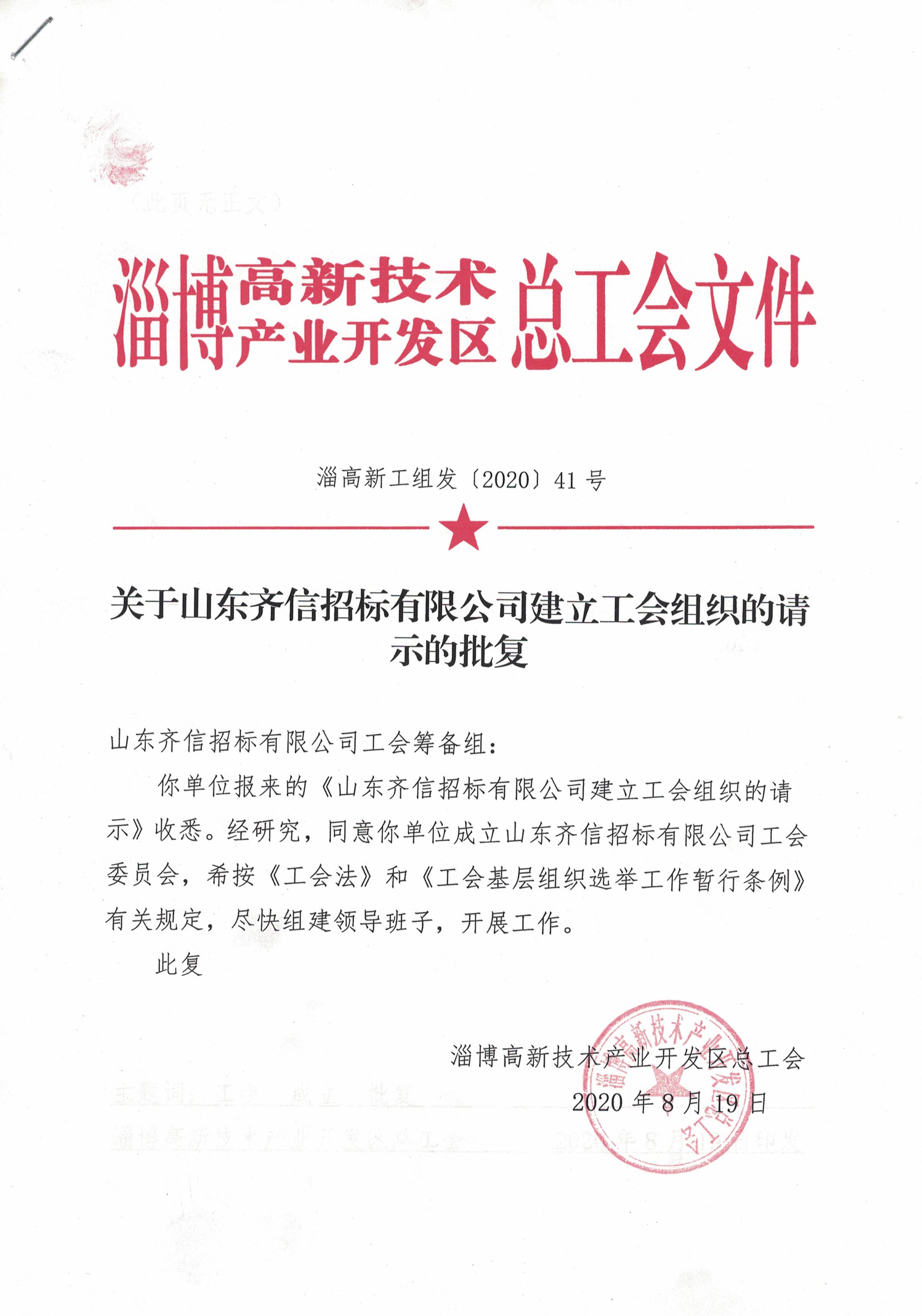 2020年9月1日,山東齊信招標有限公司工會成立會議召開,公司黨支部書記、董事長郭培勛、黨支部委員許春萌、陳秀娟、第一屆工會主席王偉等參加會議,會議由黨支部委員陳秀娟主持。