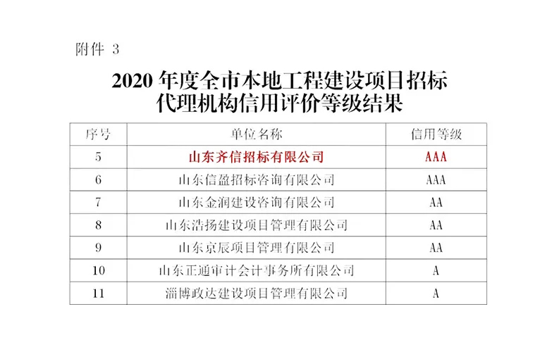 2021年5月,淄博市住建局發(fā)布《關(guān)于2020年度淄博市房地產(chǎn)開發(fā)企業(yè)等信用評價等級結(jié)果的通報》,齊信被評為淄博市工程建設(shè)項(xiàng)目招標(biāo)代理機(jī)構(gòu)AAA級信用企業(yè),列入行業(yè)誠信“紅名單”。