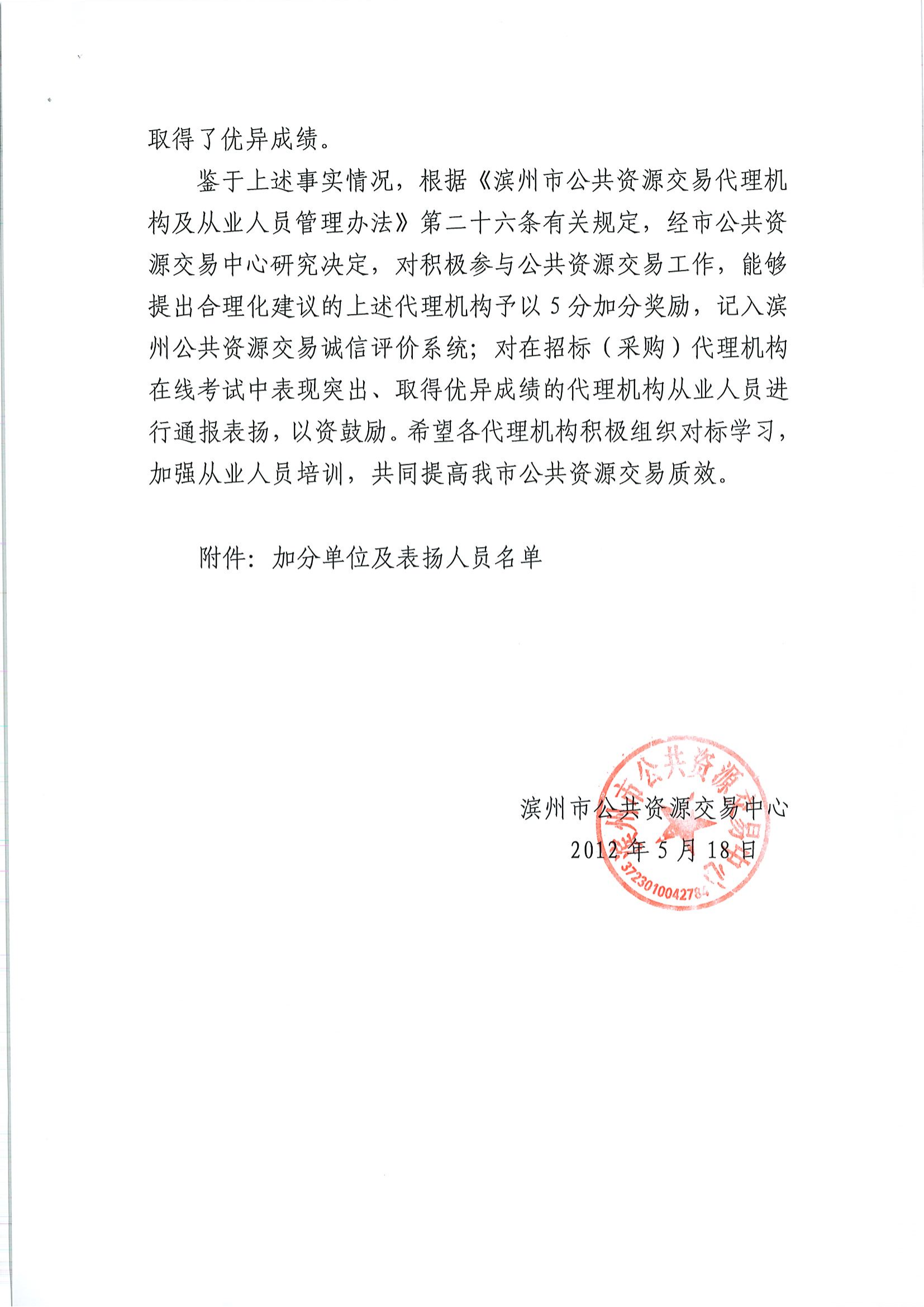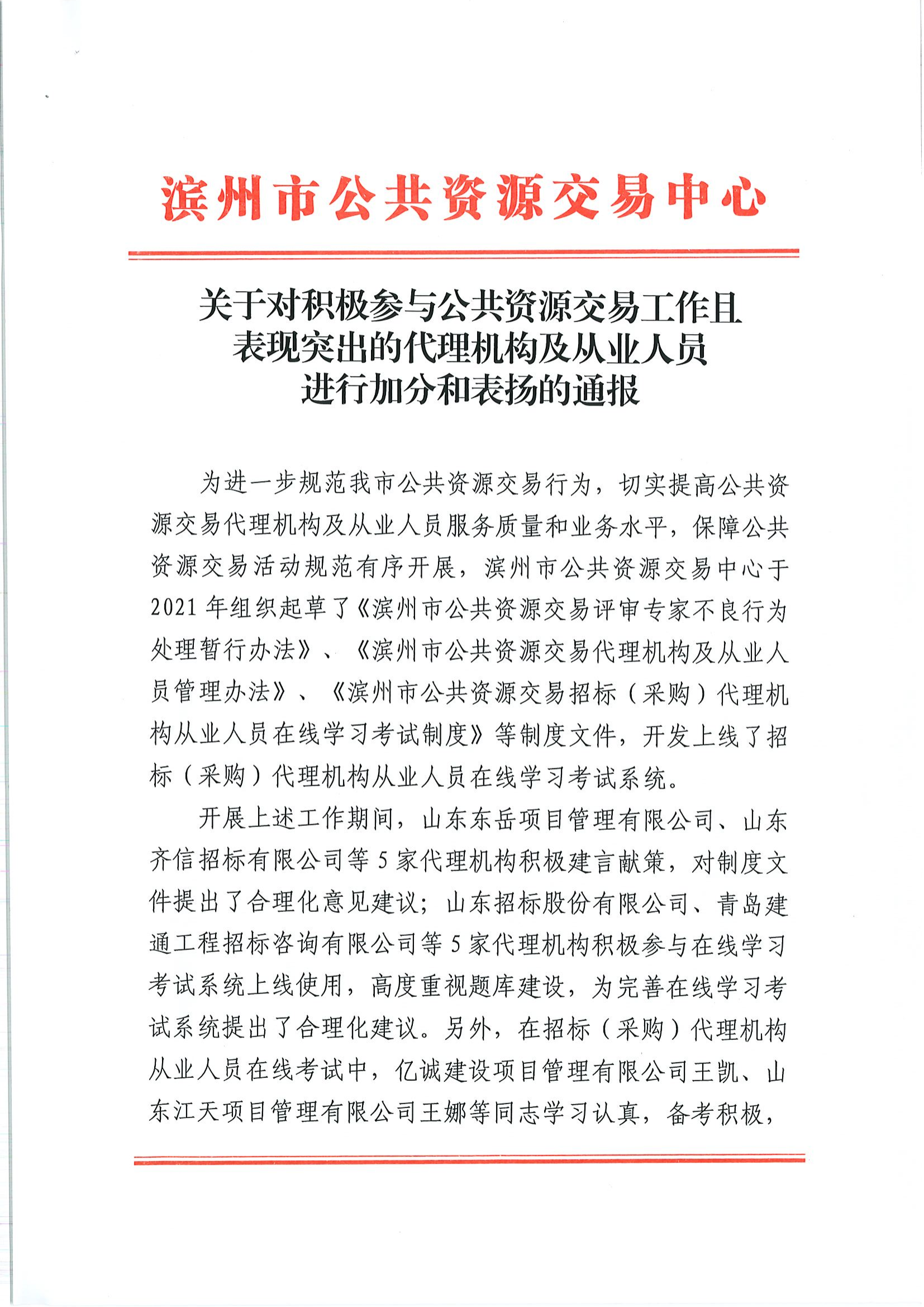 濱州市公共資源交易中心于2021年組織起草了多項(xiàng)制度文件,齊信濱州分公司積極建言獻(xiàn)策,對(duì)文件提出了合理化意見(jiàn)建議,為完善制度建設(shè)做出了突出貢獻(xiàn)。經(jīng)濱州市公共資源交易中心研究決定,對(duì)齊信予以5分加分獎(jiǎng)勵(lì),記入濱州公共資源交易誠(chéng)信評(píng)價(jià)系統(tǒng)并通報(bào)表?yè)P(yáng)。