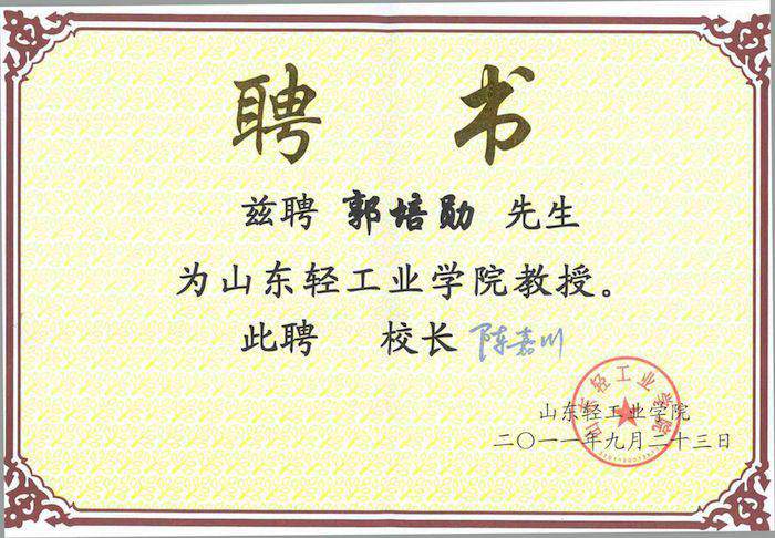 九月二十三日,我公司董事長郭培勛先生(中)受聘山東輕工業(yè)學(xué)院教授聘書頒發(fā)儀式在學(xué)院會(huì)議廳舉行,山東輕工業(yè)學(xué)院校長陳嘉川(左)親自為郭培勛先生頒發(fā)聘書,院黨委書記徐同文(右)出席了聘書頒發(fā)儀式。