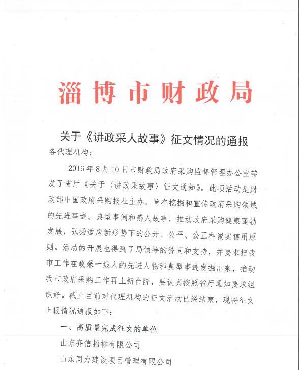 近日,在財政部中國政府采購報社主辦的關于《講政采人故事》征文的活動中,公司積極配合淄博市財政局政府采購監督管理辦公室的號召,以挖掘和宣傳淄博市政府采購領域的先進事跡、典型事例和感人故事為主線,通過樸實易懂、貼近生活的通訊文學的形式,充分展現了淄博政采人的風采,為宣傳淄博市政采風貌起到了積極地作用。