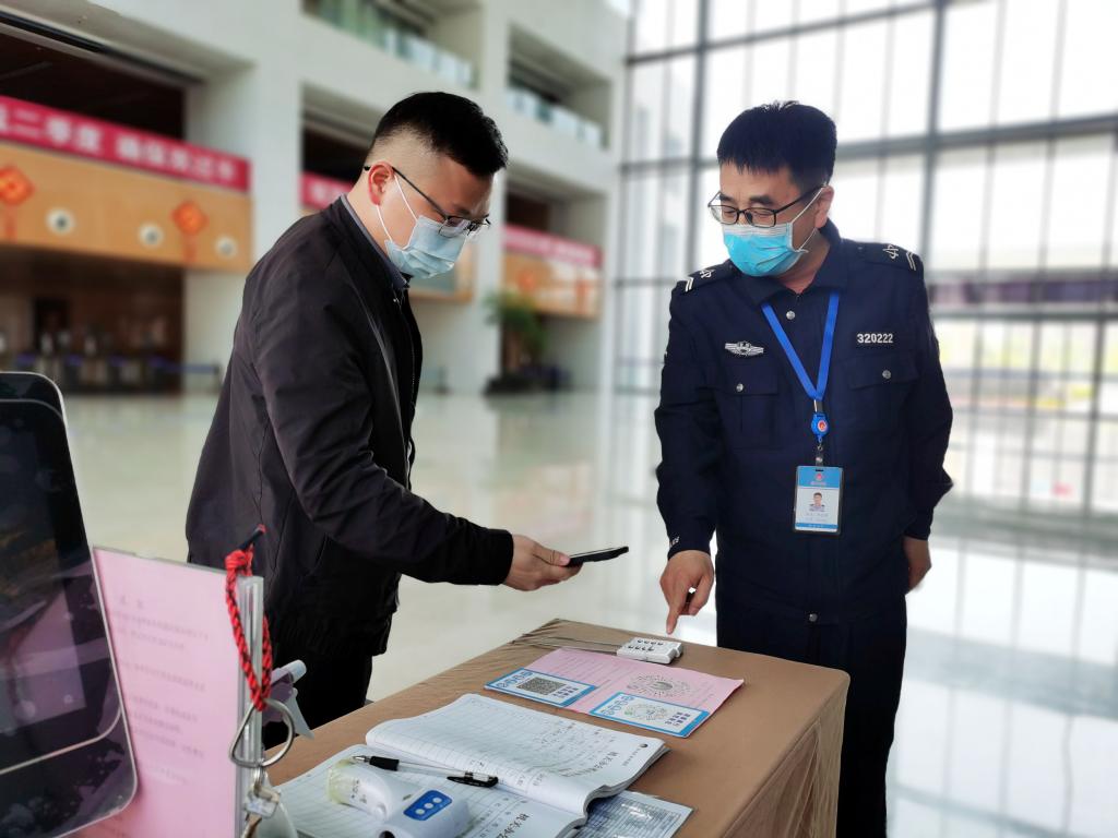 5月2日上午10:10,辦公中心西門崗值班職工孫正國(左一)在對訪客做疫情防控“雙碼”檢查。他表示,“五一”期間也要嚴格把好“入口關”,堅決保證疫情防控安全。