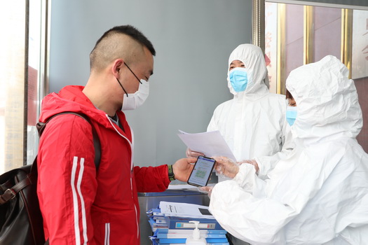 10:15,辦公中心大廳安保人員劉志強檢查進入大樓人員行程碼。他說,要守住進入大樓的“最后一關”,保證秩序平穩、衛生安全。