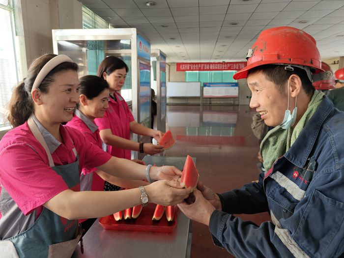 協安員在井口大廳為升、入井的職工師傅們送上西瓜和茶水,叮囑大家做好防暑降溫,牢記安全生產,把夏日清涼送到職工的心坎上。職工們紛紛表示,一定牢記囑托,時刻注意安全,認真履職盡責,確保安全生產。(撰稿:徐燕萍 呂嬋娟  審核:鄧為)