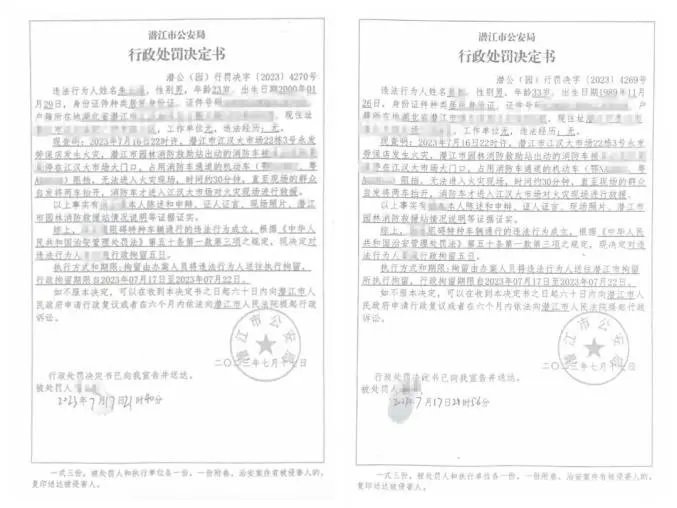 2023年7月,湖北潛江一市場門面房夜間發(fā)生火災(zāi),兩輛私家車違規(guī)停在消防通道上,違停車輛車主不能及時到場,致使消防救援車輛無法進(jìn)入,情急之下,現(xiàn)場群眾合力將違停車輛抬離。相關(guān)部門對兩位私家車主均處以行政拘留五日的處罰。