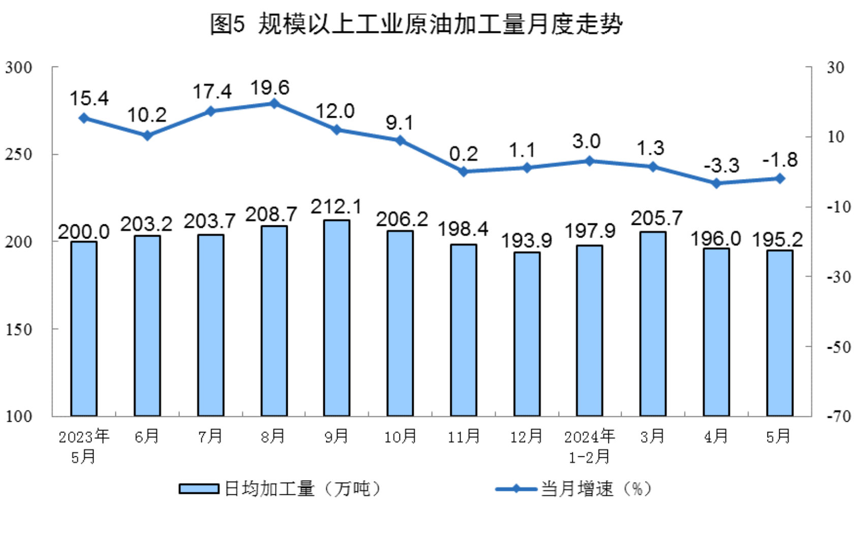 ?原油加工降幅收窄。5月份,規(guī)上工業(yè)原油加工量6052萬噸,同比下降1.8%,降幅比4月份收窄1.5個(gè)百分點(diǎn);日均加工195.2萬噸。1-5月份,規(guī)上工業(yè)原油加工量30177萬噸,同比增長0.3%。